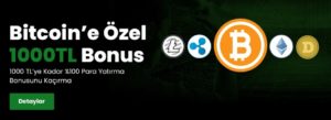 Sunduğu cömert bonuslarla da Türk bahis severlerin gözdesi olan Bets10, 31 Aralık saat 23:59’a kadar Bitcoin ile ilk kez yatırım yapan kullanıcılarına anında 1000 TL‘ye kadar %100 para yatırma bonusu veriyor. Böylece Bitcoin ile para yatırmayı tercih eden oyuncular yatırım tutarları kadar bonus alarak daha fazla kazanç elde etme şansına sahip olacaklardır.